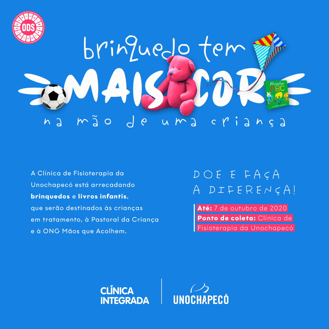 Você lembra qual era seu brinquedo favorito ou o primeiro livro que leu na infância? Normalmente, esses objetos marcam a nossa vida e são formadores base de boas memórias. Quando uma criança passa por alguma dificuldade, eles podem representar um amuleto durante aquela fase difícil. Seguindo a missão da Universidade em auxiliar à comunidade, a Clínica de Fisioterapia da Unochapecó está arrecadando brinquedos e livros, que serão destinados às crianças em tratamento na Clínica da Instituição, à Pastoral da Criança e à ONG Mãos Que Acolhem. As doações podem ser feitas até o dia 07 de outubro, na própria Clínica de Fisioterapia.