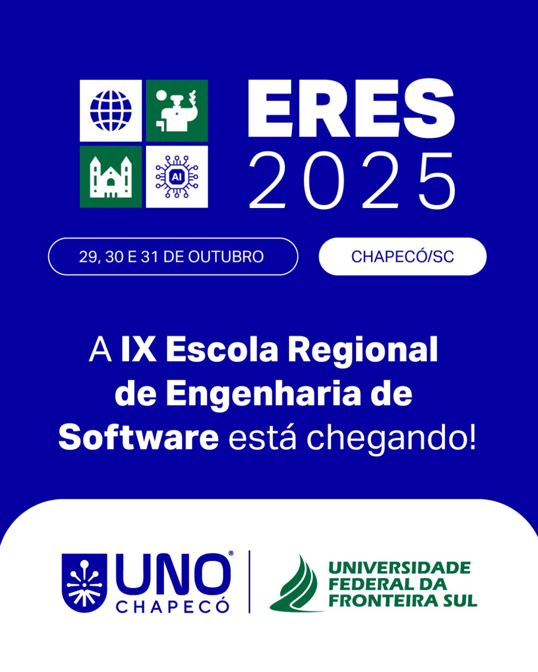Chapecó, 22 de outubro de 2025 - Estão abertas as inscrições para a IX Escola Regional de Engenharia de Software (ERES 2025), realizada nos dias 29 a 31 de outubro na Unochapecó. A ERES é promovida anualmente pela Sociedade Brasileira de Computação (SBC) e já está em sua nona edição, neste ano realizada pela Unochapecó e pela Universidade Federal da Fronteira Sul (UFFS).