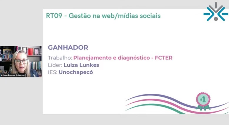 Luiza Lunkes é acadêmica do curso de Publicidade e Propaganda e aluna líder do trabalho premiado na modalidade 'Gestão na web/mídias sociais', dentro da categoria “Rádio, TV e Internet”. O trabalho leva o título de 'Planejamento e diagnóstico – FCTER'. Segundo Luiza, o trabalho baseia-se em uma proposta para aumentar a visibilidade da Fundação Científica e Tecnológica em Energias Renováveis (FCTER) e educar o respectivo público a respeito da importância da sustentabilidade. Além disso, objetiva atrair empresas para parcerias e expandir pesquisas na área.
