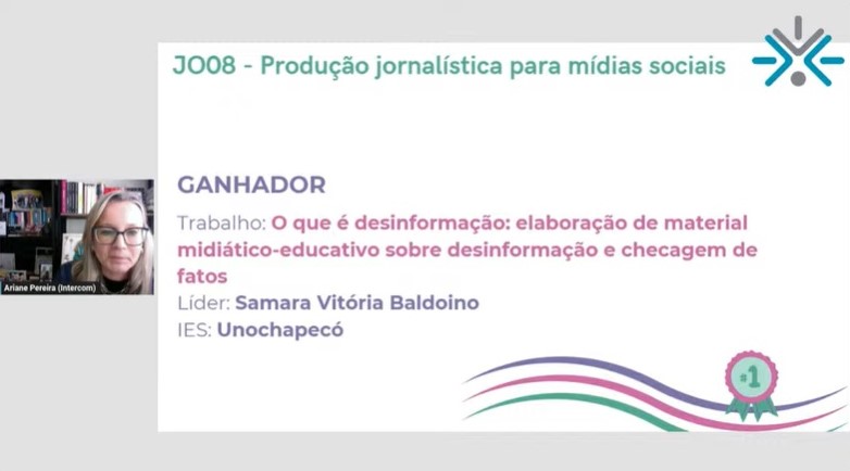 Samara Baldoino é estudante do quarto período de Jornalismo e aluna líder do outro trabalho premiado. Com o título 'O que é desinformação: elaboração de material midiático-educativo sobre desinformação e checagem de fatos', o trabalho foi premiado na modalidade 'Produção jornalística para mídias sociais'. “Nosso trabalho é um compilado de vídeos produzidos no segundo período do curso, na disciplina de Jornalismo de Dados”, afirma Samara. Ela conta que os vídeos foram produzidos em formato de reels por estudantes da turma, individuais ou em grupos, e que buscavam trabalhar assuntos da disciplina de forma dinâmica e acessível ao público. Samara ressalta que, para a inscrição, foram escolhidos cinco dos vídeos produzidos.