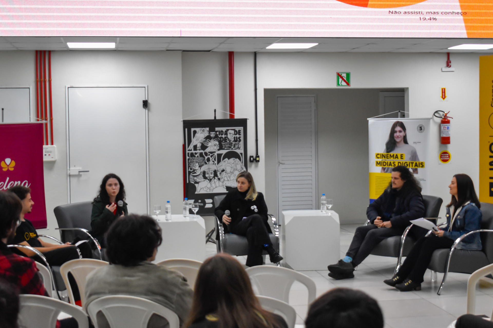 Após a apresentação da pesquisa, houve um debate para falar sobre o consumo de audiovisual na região Oeste de Santa Catarina, com Bruna Boita, egressa do curso de Produção Audiovisual, Kelvin Cigognini, Mestre em Cinema e Artes do Vídeo, e a professora Valéria Feijó, Doutora e Mestra em Design e Branding.