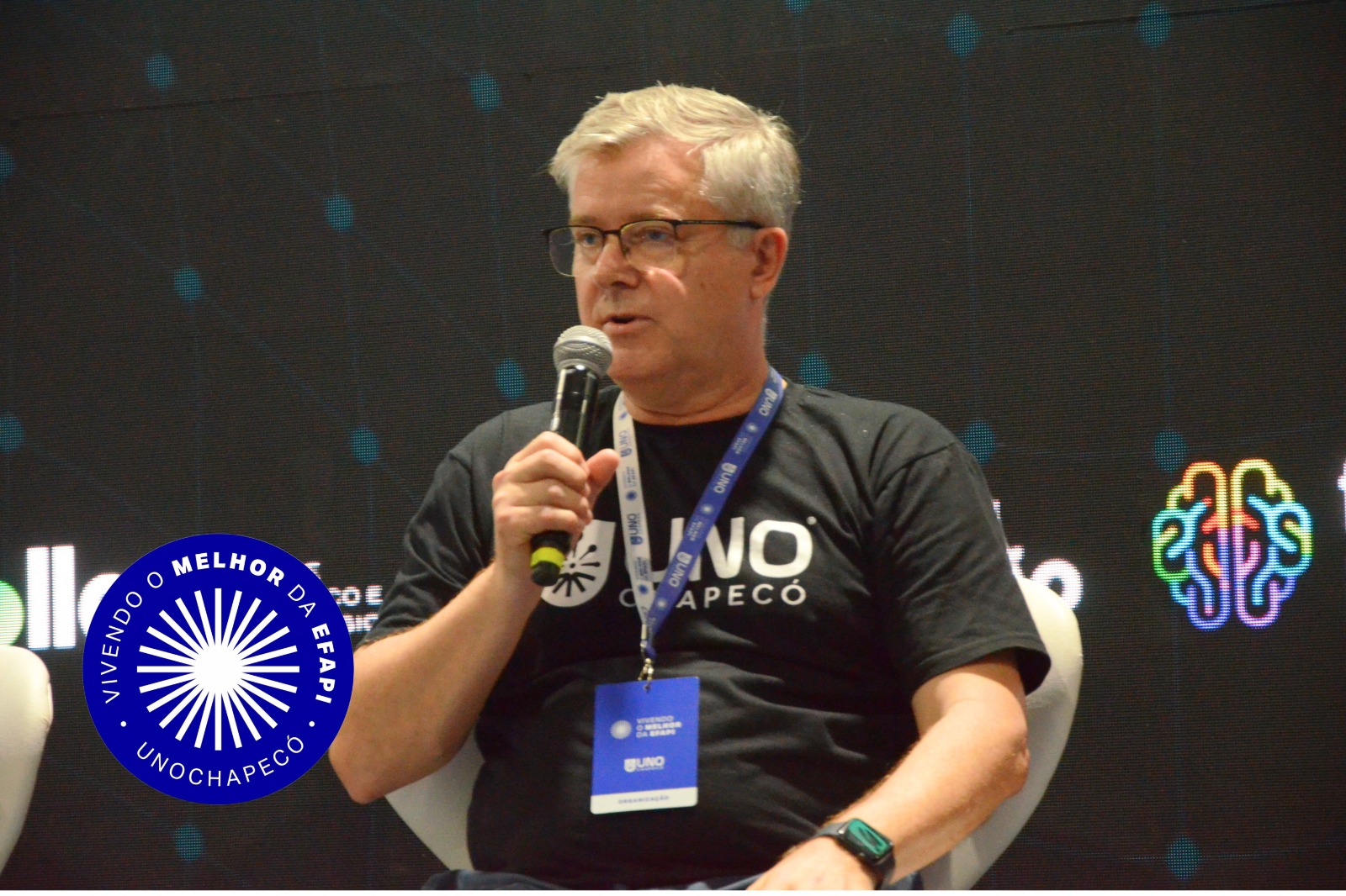 Chapecó, 16 de outubro de 2025 - Na tarde desta quinta-feira (16), o reitor da Unochapecó, professor Claudio Jacoski, representou a Instituição e o Pollen Parque Tecnológico no painel ‘Ecossistema de inovação de Chapecó: ações que geram resultado’. No momento, que aconteceu no Parque Desbravalley durante a Efapi do Brasil, o professor falou sobre a construção da Unochapecó para tornar-se um Smart Campus e o centro de inovação da Uno, o Pollen.